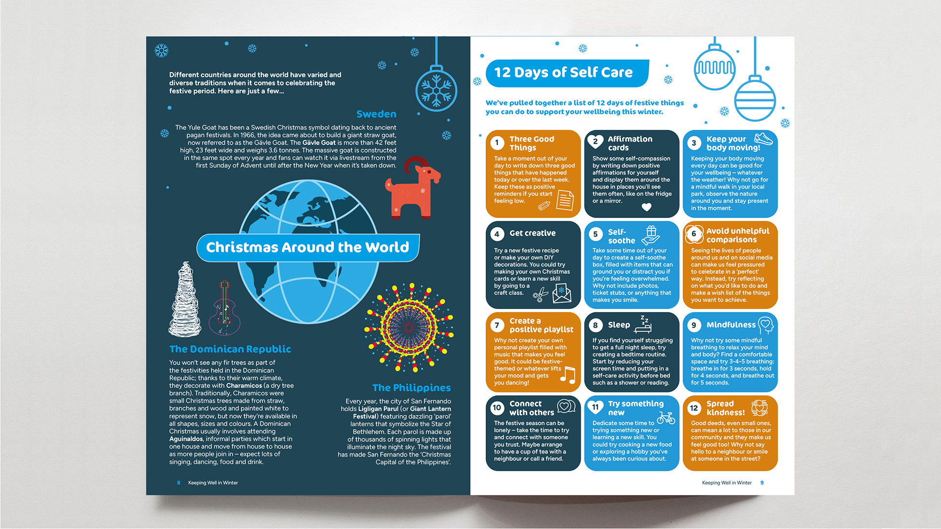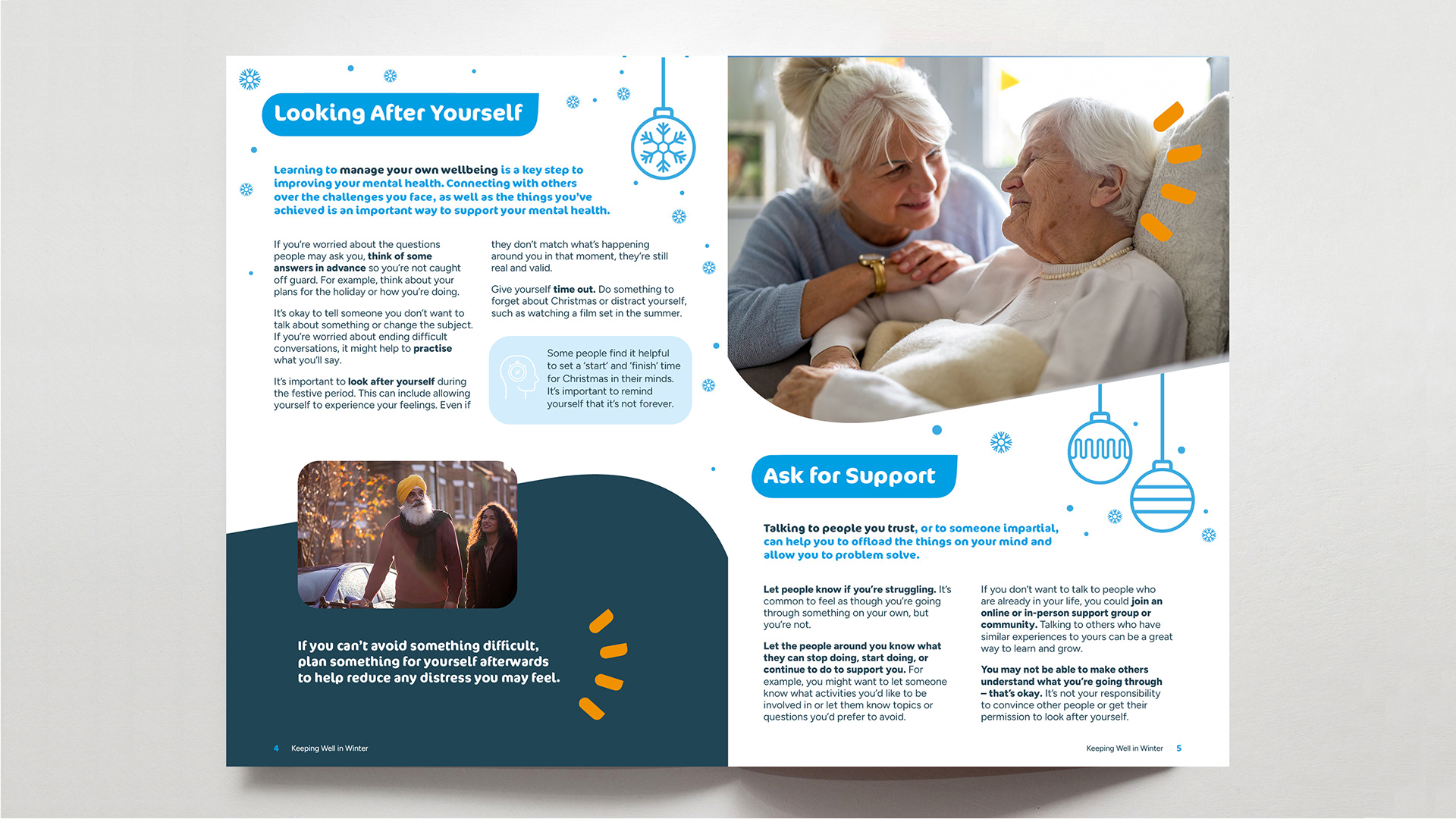 A meaningful booklet design for South East London Mind, focusing on providing mental health support and wellbeing tips for people in their catchment area during the challenging winter and Christmas season. Using typography, illustrations, and photography to create an easy-to-use, engaging resource that not only clearly informs but also gently reminds residents that help is always within reach during the winter.