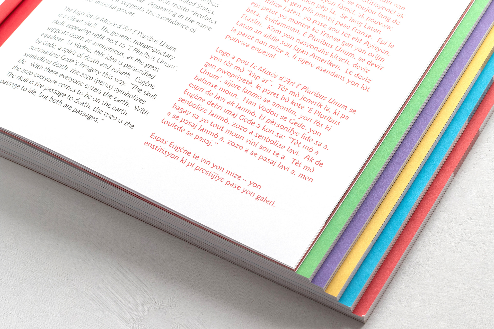 Commissioned to design this complex 236 page, dual language arts festival catalogue. The Ghetto Biennale is a cross cultural arts festival held in Port-au- Prince, Haiti. The catalogue design is comprised of 6 laser step cut sections that celebrates the work of the first four Ghetto Biennales from 2009 to 2015. The colourful design is grafted from the ornately decorated ‘tap tap’ buses seen throughout the country. Catalogue design, image sourcing, print buying and management.